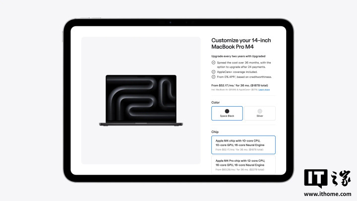 据介绍,相应计划主要就是将MacBook系列产品分期为36期,其中MacBookAir每月使用费用33.28美元(IT之家注:现汇率约合239元人民币)起、MacBookPro每月使用费用为52.17美元(现汇率约合374元人民币)起,用户在分期2年(完成24期)后即可将自己的设备免费升级至最新款MacBook,开启新一轮36期付款周期,或继续支付剩余的12期费用,永久买断手中的产品。